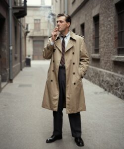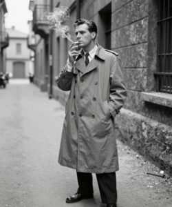 The prompt: “a man in a trench coat stands in a deserted alleyway smoking a cigarette, 1950s retro”. The second image simply adds “black and white” and you get an instant retro classic!