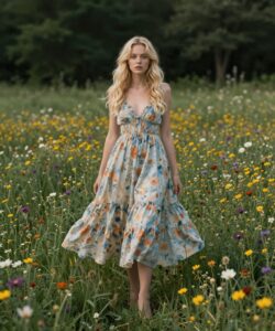 The prompt: “a beautiful blonde woman in a flowing summer dress stands in a field of wildflowers”. The second image simply adds the term “dystopian”. Notice the more somber color palette and her facial expression that seems to hint that things aren’t quite ok.
