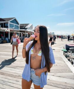 The prompt: “a pretty social media influencer eating an ice cream cone on a busy boardwalk”. The second image simply adds “fisheye lens”. Much more eye-catching!